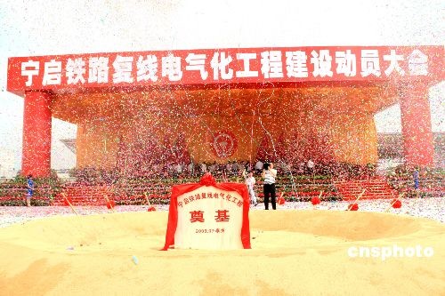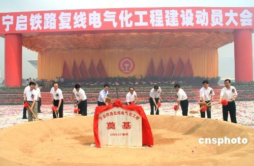 7月14日,寧啟鐵路復(fù)線電氣化工程建設(shè)動(dòng)員大會(huì)在江蘇省泰州市泰州火車(chē)站舉行。國(guó)家鐵道部部長(zhǎng)劉志軍、江蘇省委書(shū)記梁保華、省長(zhǎng)羅志軍,上海鐵路局局長(zhǎng)安路生以及泰州市委書(shū)記張雷等出席。寧啟線路全長(zhǎng)約268.3公里,項(xiàng)目總投資139億元,工期3年。建成后南京至南通運(yùn)行時(shí)間將從3小時(shí)50分縮短至1小時(shí)50分。圖為鐵道部、江蘇省有關(guān)領(lǐng)導(dǎo)共同為工程奠基。中新社發(fā) 崔佳明 攝