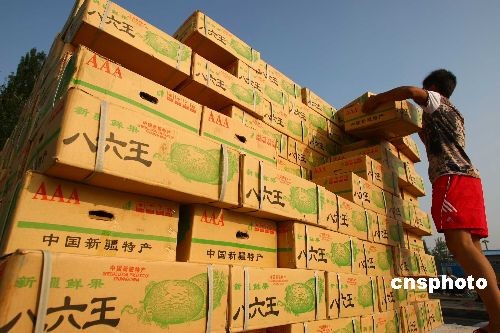 7月24日,新疆特產(chǎn)哈密瓜在北京新發(fā)地農(nóng)貿(mào)市場(chǎng)熱銷(xiāo)。時(shí)至盛夏,新疆的各色水果正陸續(xù)成熟,在當(dāng)?shù)毓r(nóng)喜迎豐收的同時(shí),相關(guān)政府部門(mén)采取措施幫助他們打開(kāi)銷(xiāo)路。7月21日,國(guó)家商務(wù)部和新疆維吾爾自治區(qū)政府在烏魯木齊組織召開(kāi)“新疆農(nóng)產(chǎn)品產(chǎn)銷(xiāo)對(duì)接洽談會(huì)”,來(lái)自廣東、北京等地的19家大型農(nóng)產(chǎn)品批發(fā)零售企業(yè)與當(dāng)?shù)毓⿷?yīng)商及生產(chǎn)基地簽訂近40萬(wàn)噸的采購(gòu)協(xié)議。中新社發(fā) 富田 攝