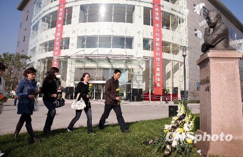 11月3日下午,中國目前最具實(shí)力的空間技術(shù)及其產(chǎn)品研制基地、人造衛(wèi)星和神舟飛船的“搖籃”——中國空間技術(shù)研究院在北京航天城舉行儀式,深切緬懷該院老院長(zhǎng)、“中國航天之父”錢學(xué)森。正在中國空間技術(shù)研究院就讀研究生的航天青年學(xué)子們面朝錢學(xué)森塑像列隊(duì)肅立默哀一分鐘,向錢老塑像敬獻(xiàn)花籃,隨后依次手持黃、白菊花敬獻(xiàn)錢老塑像并鞠躬致敬。中新社發(fā) 孫自法 攝