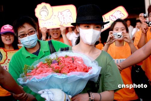 2009年7月11日,鐘欣桐(阿嬌)到達(dá)哈爾濱,晚7點(diǎn)多從機(jī)場(chǎng)出來,她戴著防流感口罩,上身穿綠色短袖長衫,頭帶黑亞麻粗編禮帽走出機(jī)場(chǎng),F(xiàn)場(chǎng)粉絲很多,阿嬌隨走隨接受粉絲們的禮物和鮮花。阿嬌將于7月12日在哈爾濱冰雪大世界園區(qū)嘉年華現(xiàn)場(chǎng)與觀眾見面。中新社發(fā) 姚庭山 攝
