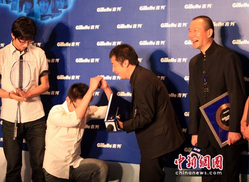 6月20日,第六代導(dǎo)演領(lǐng)軍人物賈樟柯(右二)攜手國(guó)際知名音樂(lè)人譚盾(右),在上海出席“吉列自信男人,為中國(guó)露臉”活動(dòng),現(xiàn)場(chǎng)一位80后“未來(lái)之星”,突然跪地,向賈樟柯拜師,著實(shí)讓與會(huì)者意外,但是,也讓現(xiàn)場(chǎng)嘉賓看到年輕人自信所在。