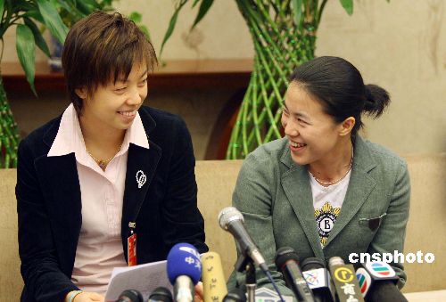 十月十七日,中共十七大代表、乒乓球運(yùn)動(dòng)員王楠、張怡寧在北京梅地亞中心接受中外媒體采訪。當(dāng)有記者問(wèn)及訓(xùn)練以外的生活細(xì)節(jié)時(shí),二人相視而笑。中新社發(fā) 毛建軍 攝
