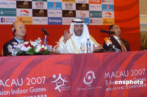 十月二十八日,亞奧理事會主席薩巴赫親王(中)在澳門第二屆亞洲室內(nèi)運(yùn)動會記者會上,盛贊第二屆亞洲室內(nèi)運(yùn)動會的組織工作非常成功,今后會更加成功。中新社發(fā) 史利 攝