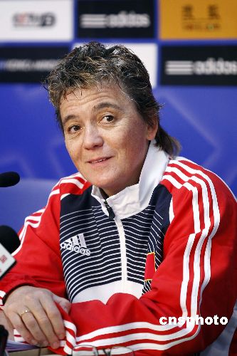 十月二十八日,中國(guó)足協(xié)在北京召開新聞發(fā)布會(huì),宣布前法國(guó)女足主帥伊麗莎白正式接替多曼斯基的帥位,擔(dān)任中國(guó)女足主教練。她的合約期將持續(xù)到2008年奧運(yùn)會(huì)結(jié)束。伊麗莎白在發(fā)布會(huì)上發(fā)布了就職演說。中新社發(fā) 盛佳鵬 攝