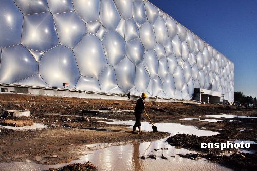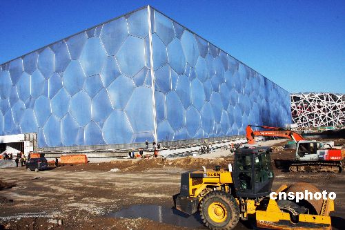 10月28日,北京國家游泳中心“水立方”工地,工人們正在緊張施工。據(jù)了解,陽光下呈淡藍(lán)色的國家游泳中心“水立方”目前總體工程建設(shè)進(jìn)展順利,并將于2007年年底全部完工。中新社發(fā) 鄭雄增 攝