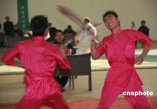 2007年11月19日,為期3天的“2007中國安徽首屆傳統(tǒng)武術(shù)大會暨武術(shù)套路國際邀請賽”在安徽省黃山市舉行。本次比賽分為傳統(tǒng)武術(shù)和武術(shù)套路兩個部分,其中有個人單項(xiàng)、個人全能比賽;有傳統(tǒng)拳術(shù)、傳統(tǒng)器械、對練3個項(xiàng)目。來自中國、美國、澳大利亞、波蘭、日本、新加坡、加蓬、越南、菲律賓、古巴和中國香港等十多個國家和地區(qū),共有43支代表隊(duì)的439名運(yùn)動員參加比賽。中新社發(fā) 方也廣德 攝