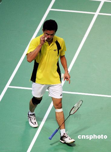 十一月三十日晚,世界排名第一的中國(guó)選手林丹在二零零七中國(guó)香港羽毛球超級(jí)賽上以二比零戰(zhàn)勝印尼名將陶菲克,晉級(jí)四強(qiáng)。圖為陶菲克在比賽中摔拍。中新社發(fā) 武仲林 攝
