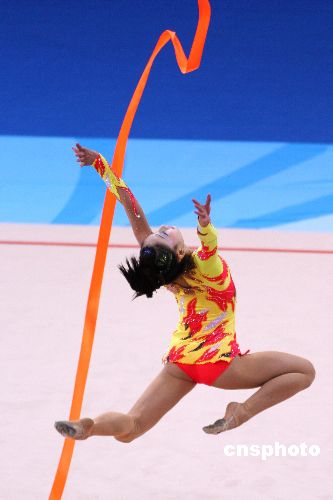 圖為中國選手丁一丹在進(jìn)行繩操比賽,她晉級(jí)了明日的決賽。