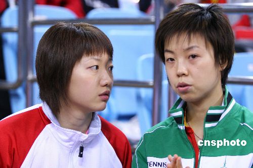 12月15日,“好運北京”大眾汽車2007國際乒聯(lián)職業(yè)巡回賽總決賽在北京大學體育館繼續(xù)進行,在一場女單1/4決賽中,張怡寧以4-0(11-6,11-4,11-5,11-6)擊敗新加坡一姐李佳薇,輕松挺進四強。張怡寧與李佳薇有過多次交戰(zhàn),加上兩人都曾在北京隊學習訓練,因此都十分了解對手。圖為比賽前兩人在場下交流。中新社發(fā) 富田 攝