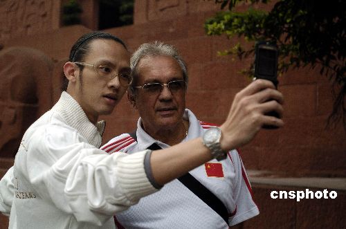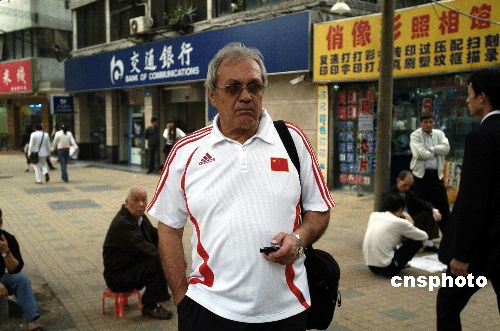 2007年12月17日下午,中國國奧隊主教練杜伊利用閑暇時光在廣州逛街,途中被球迷認出與其合影。中新社發(fā) 吳峻 攝