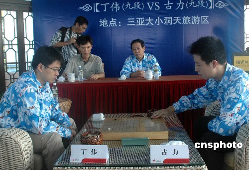 十二月十八日,第二十屆中國(guó)圍棋名人戰(zhàn)決賽在海南省三亞市大小洞天旅游區(qū)拉開序幕,由丁偉九段挑戰(zhàn)上屆冠軍古力九段。在首輪比賽中,古力執(zhí)黑以一又四分之三子戰(zhàn)勝丁偉,在五番棋中拔得頭籌。雙方第二輪比賽將于二十日在同一地點(diǎn)進(jìn)行。圖為雙方在比賽中。中新社發(fā) 尹海明 攝