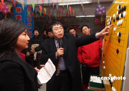 1月15日,聶衛(wèi)平在湖南漣源市與5位棋手展開車輪大戰(zhàn)。當(dāng)日,聶衛(wèi)平與漣源市迎奧運首屆“九龍杯圍棋大獎賽”冠軍胡軍民、亞軍潘勇、劉小希等5位棋手展開車輪大戰(zhàn)。聶衛(wèi)平分別讓給他們2-4個子,經(jīng)過2個多小時的決戰(zhàn),聶衛(wèi)平“輸”給胡軍民、潘勇、劉小希3人,贏取另2人。賽后聶衛(wèi)平為婁底市百多名棋手講解精彩圍棋。中新社發(fā) 郭國權(quán) 攝