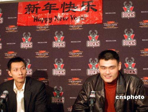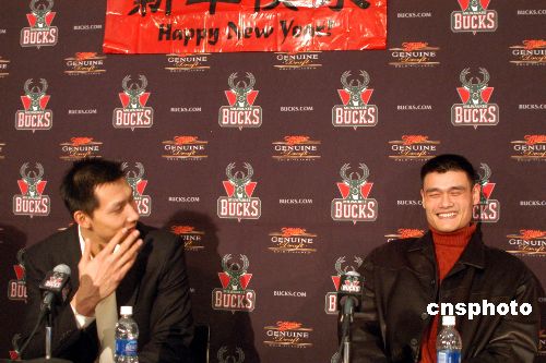 當(dāng)?shù)貢r(shí)間二月二日,姚明率領(lǐng)休斯敦火箭隊(duì)作客密爾沃基布拉德利球館,最終火箭隊(duì)以九十一比八十三險(xiǎn)勝另一名中國球員易建聯(lián)所在的雄鹿隊(duì),獲得三連勝。賽后兩位“中國德比大戰(zhàn)”的主角在雄鹿隊(duì)特地安排的聯(lián)合記者會(huì)上談笑風(fēng)生,一同向中國球迷致以新春祝福。中新社發(fā) 李靜 攝