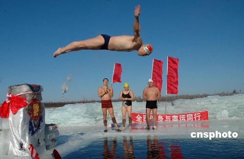 2月7日,黑龍江黑河市冬泳俱樂部與俄羅斯布拉戈維申斯克市冬泳俱樂部的30多名隊員,在黑河市中俄界江冒著零下30度的嚴(yán)寒,以冬泳方式歡度新春佳節(jié)。中新社發(fā) 邱齊龍 攝