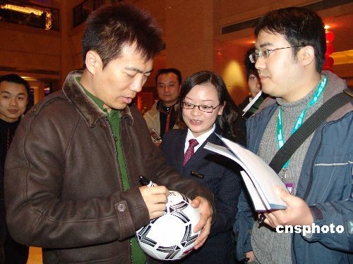 2月17日晚,著名足球解說(shuō)員黃健翔在永川球迷的簇?fù)硐聫闹貞c江北機(jī)場(chǎng)抵達(dá)下塌的永川名豪國(guó)際酒店,受到媒體記者及球迷的歡迎。據(jù)了解,黃健翔回故鄉(xiāng)永川,是為了參加2008東亞女足錦標(biāo)賽決賽和回老家祭祖。中新社發(fā) 陳仕川 攝