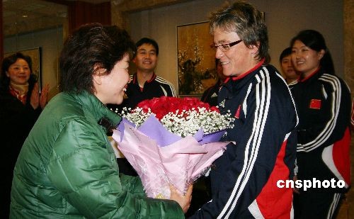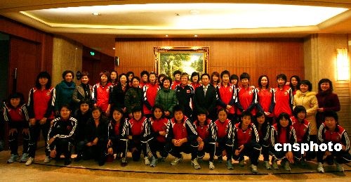 2月20日晚,重慶市婦聯(lián)主席蘭運(yùn)華一行代表全市1500萬婦女和球迷看望慰問中國女足的全體隊(duì)員和教練員,希望她們?cè)賱?chuàng)佳績。同時(shí)向姑娘們贈(zèng)送了鮮花、“鏗鏘玫瑰”書法、重慶特色的三峽碟畫等。中新社發(fā) 陳仕川 攝