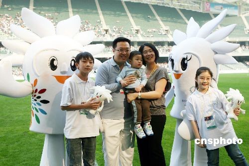 三月九日,市民在香港大球場與二零零九東亞運動會吉祥物“東仔”、 “亞妹”合影留念。當(dāng)日,香港有史以來舉辦的最大型國際運動會——二零零九東亞運動會吉祥物正式揭幕,吉祥物以“火”及“獅子”為概念,表達香港人自強不息的拼搏精神。中新社發(fā) 武仲林 攝