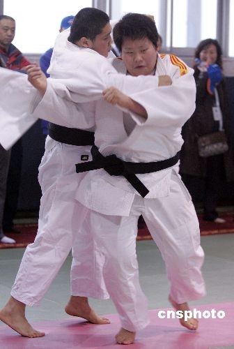 三月十二日,世界冠軍佟文(右)等中國女子柔道隊優(yōu)秀選手在天津訓(xùn)練基地與男選手對練,為奧運奪金積極備戰(zhàn)。中新社發(fā) 毛建軍 攝