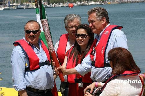 葡萄牙當(dāng)?shù)貢r(shí)間5月4日下午,F(xiàn)1摩托艇世錦賽葡萄牙站比賽在葡萄牙波爾蒂芒舉行,北京2008奧運(yùn)火炬手羅雪娟帶著她收藏的“祥云”奧運(yùn)火炬來(lái)到F1賽場(chǎng),在賽場(chǎng)會(huì)議上羅雪娟和國(guó)際摩聯(lián)F1委員會(huì)主席尼克魯共同呼吁:“崇尚體育精神、支持北京奧運(yùn)”。在本次2008F1摩托艇世錦賽決賽前,羅雪娟和她收藏的“祥云”火炬被國(guó)際摩聯(lián)邀請(qǐng)到巡游艇上,進(jìn)行賽前繞場(chǎng)一周巡游。這是奧運(yùn)火炬首次出現(xiàn)在F1賽場(chǎng)。中新社發(fā) 北京泓鼎 攝