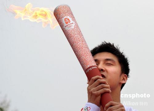 7月4日,奧運(yùn)火炬在陜西西安傳遞,中國著名跳水運(yùn)動(dòng)員田亮作為西安第一棒火炬手在小雁塔下深情親吻奧運(yùn)火炬。 中新社發(fā) 廖攀 攝