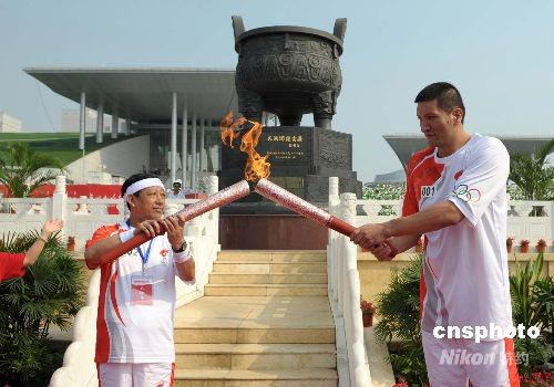 7月8日,奧運火炬在內(nèi)蒙古呼和浩特市進行傳遞,曾在美國參加NBA聯(lián)賽并獲得過總冠軍的中國著名蒙古族籃球中鋒巴特爾傳遞首棒火炬。 圖為巴特爾在民族團結鼎前和湯愛軍交接奧運火炬。中新社發(fā) 廖攀 攝