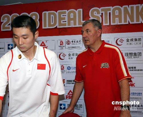 7月16日,到杭州參加2008斯坦科維奇洲際杯籃球賽的中國(guó)男籃主教練尤納斯與主力后衛(wèi)劉煒在出席新聞發(fā)布會(huì)時(shí)向媒體透露,傷愈的姚明肯定將在比賽中上場(chǎng)。但是尤納斯對(duì)中國(guó)男籃在北京奧運(yùn)會(huì)的前景三緘其口。中新社發(fā) 任晨鳴 攝