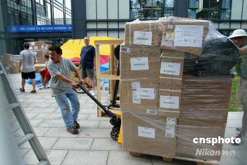 7月20日,美國奧運代表團在北師大體育館前搬運剛剛運抵的物資。像雅典奧運會一樣,美國奧運代表團沒有選擇官方提供的奧運村,這次他們把自己的訓練中心放在北京師范大學。美國奧運代表團的先頭部隊將在本月底入駐北師大,其中包括科比、詹姆斯等明星。中新社發(fā) 富田 攝
