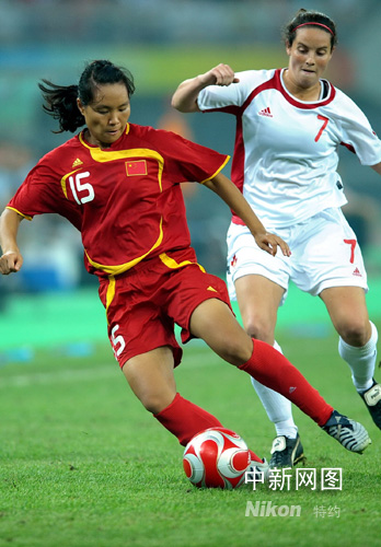 8月9日晚,中國女足在天津奧體中心水滴體育場(chǎng)與加拿大女足進(jìn)行奧運(yùn)第二場(chǎng)小組賽的較量。目前中國和加拿大女足同積3分,這場(chǎng)E組積分榜首之爭(zhēng)事關(guān)出線大局。中國女足15號(hào)周高萍帶球突破。中新社發(fā) 陳文 攝