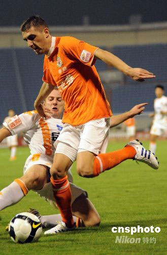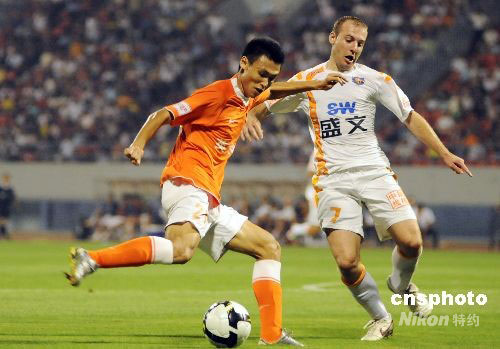 2008年9月7日,中國足球超級聯(lián)賽第9輪在山東濟(jì)南的一場比賽,主場作戰(zhàn)的山東魯能泰山隊以2比1戰(zhàn)勝青島盛文中能隊。中新社發(fā) 張侃 攝