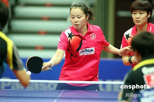 9月14日,2008年國際乒聯(lián)職業(yè)巡回賽中國乒乓球公開賽在上海舉行。香港選手帖雅娜(左)與隊友姜華珺在女子雙打的比賽中,在落后3局的情況下,上演大逆轉以4:3戰(zhàn)勝中國選手郭躍與李曉霞組合,獲得冠軍。中新社發(fā) 湯彥俊 攝