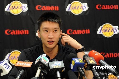 9月24日下午,美國(guó)NBA洛杉機(jī)湖人隊(duì)在自己的訓(xùn)練基地舉行記者會(huì),正式向媒體記者介紹剛剛加盟的中國(guó)球員孫悅。孫悅在記者會(huì)上用流利的英語(yǔ)回答記者提問(wèn)。孫悅說(shuō),他對(duì)自己在湖人隊(duì)的位置很清醒,自己會(huì)加倍努力,盡量多爭(zhēng)取上場(chǎng)時(shí)間。圖為孫悅向記者解釋外號(hào)“Q”的來(lái)歷。中新社發(fā) 張煒 攝