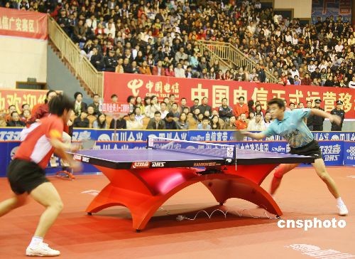 10月11日,王皓、郝帥在岳廣安市岳池縣體育館進(jìn)行男子乒乓球賽。當(dāng)晚, 2008年中國(guó)乒乓球超級(jí)聯(lián)賽第三輪比賽在四川省廣安市進(jìn)行。四川全興隊(duì)迎戰(zhàn)八一工商銀行隊(duì)。中新社發(fā) 杜修戰(zhàn) 攝