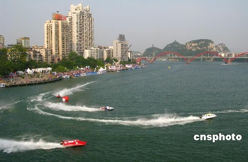 10月12日,2008F1摩托艇世界錦標(biāo)賽中國柳州站大獎(jiǎng)賽落幕。來自12個(gè)國家19支隊(duì)伍經(jīng)過激烈角逐,卡塔爾隊(duì)的美國名將杰伊.普萊斯發(fā)揮出色,勇奪本站冠軍。塔斯克兄弟競技隊(duì)大衛(wèi)·塔斯克獲得亞軍。意大利選手法比奧·卡姆帕拉獲第三。中新社發(fā) 曹偉軍 攝