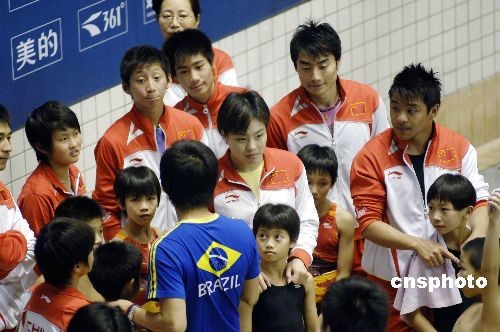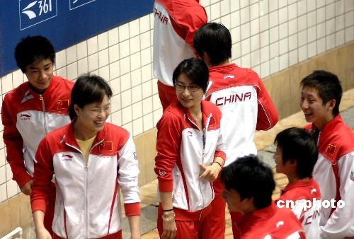 10月18日,奪得北京奧運7金1銀3銅的中國跳水“夢之隊”成員郭晶晶、吳敏霞、何沖等在福州給小跳水運動員傳授技藝。當(dāng)日,2008全國跳水錦標(biāo)賽在福建省體育中心游泳跳水館開賽。中新社發(fā) 王東明 攝