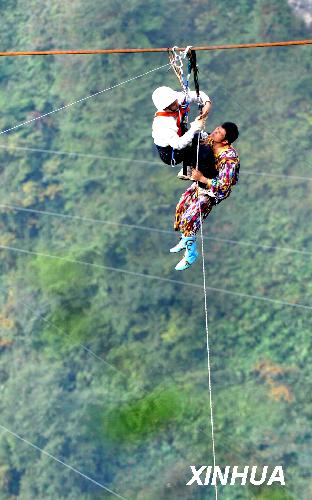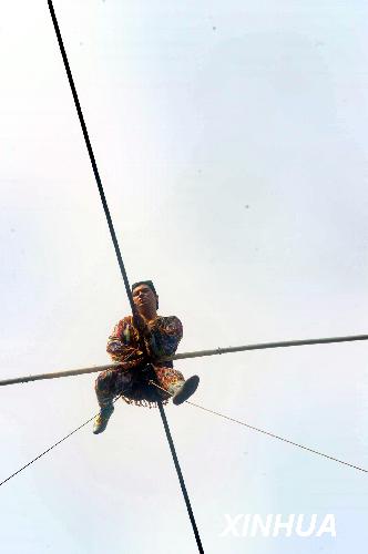10月18日,新疆“達瓦孜”傳人賽買提·艾山在湖南張家界市天門山挑戰(zhàn)世界最大坡度高空走鋼絲時發(fā)生意外,在距終點50米處跌坐在鋼繩上,被迫放棄挑戰(zhàn)。意外發(fā)生后,地面安全人員及時展開救援,歷時1小時16分鐘將懸坐在400米高空鋼繩上的賽買提順利救出。 新華社記者龍弘濤攝