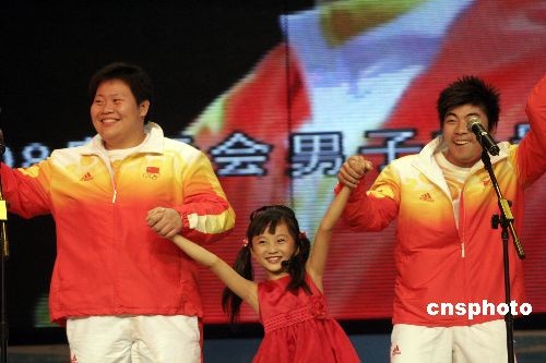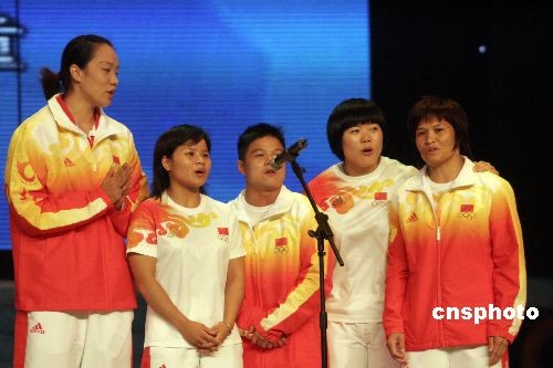 10月21日晚,贏得北京奧運(yùn)會(huì)拳擊、跆拳道、舉重、柔道、摔跤等項(xiàng)目的奧運(yùn)冠軍,包括張小平、鄒市明、陸永、陳燮霞、劉春紅、曹磊、王嬌、吳靜鈺、冼東妹、佟文、龍清泉、張湘祥、廖輝及前奧運(yùn)會(huì)女子跆拳道冠軍陳中等14位奧運(yùn)冠軍,參加“三亞城市精神評(píng)選暨奧運(yùn)冠軍三亞行活動(dòng)”晚會(huì),為觀眾演唱歌曲《真心英雄》。中新社發(fā) 尹恩彪 攝