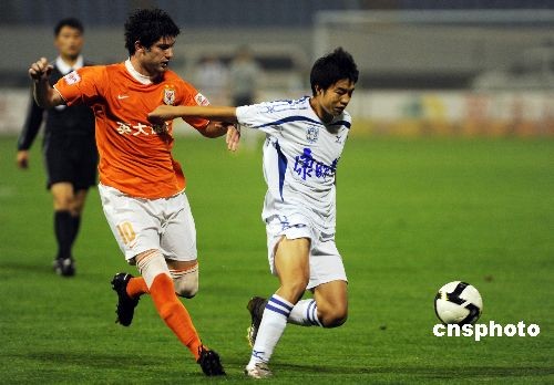 2008年10月22日,中國足球超級聯(lián)賽第23輪在山東濟南的一場比賽中,主場作戰(zhàn)的山東魯能泰山隊以1-1戰(zhàn)平天津康師傅隊。中新社發(fā) 張侃 攝