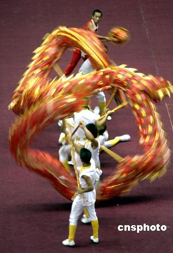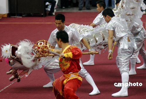 10月27日,第六屆全國農(nóng)運(yùn)會舞龍規(guī)定套路比賽在泉州石獅體育館舉行,精彩的比賽讓現(xiàn)場觀眾連連喝彩,掌聲不斷。中新社發(fā) 王東明 攝