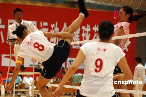 十月二十七日,第六屆全國農(nóng)運會毽球花毽比賽在泉州市海峽體育中心訓練館開鑼。上海女隊隊員(粉紅)在女子團體賽中成功化解天津女隊的進攻,最終以2:0戰(zhàn)勝天津隊。中新社發(fā) 鄭祚聲 攝
