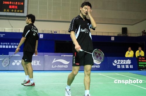 11月21日,在上海進行的2008年中國羽毛球公開賽男雙1/4決賽中,中國頭號男雙組合蔡赟/傅海峰以1比2不敵跨國組合陳甲亮/吳俊明無緣四強,三局的比分為17比21、21比19和21比18。中新社發(fā) 湯彥俊 攝