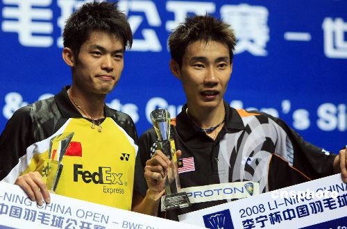 11月23日,在上海舉行的2008年中國(guó)羽毛球公開(kāi)賽男子單打決賽中,中國(guó)頭號(hào)選手林丹(左)以2比0戰(zhàn)勝馬來(lái)西亞選手李宗偉(右),獲得冠軍。這也是他第三次奪得中國(guó)羽毛球公開(kāi)賽的冠軍。中新社發(fā) 湯彥俊 攝