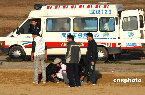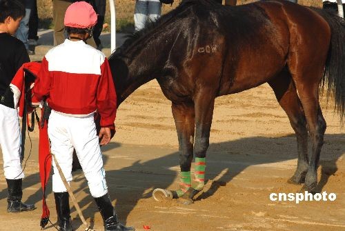 11月30日,在湖北武漢市“東方馬城”舉行的2008年全國速度賽馬錦標(biāo)賽上,2600米沙地?zé)o限定馬決賽第二組在比賽時,發(fā)生賽馬“追尾”驚險一幕。在跑到第二圈進入最后全力沖刺時,新疆隊唐旭駕馭的7號馬“巴黎之眼”避讓不及北京隊魏云忠駕馭的10號馬“賽速”,兩馬重重地撞在一起,“巴黎之眼”當(dāng)場被撞暈倒地不醒,“賽速”右前蹄則被撞斷受傷嚴(yán)重,所幸兩名運動員均無大礙。據(jù)業(yè)內(nèi)人士介紹,賽馬運動屬于高風(fēng)險運動,運動員和馬匹在激烈的比賽過程中,都有出現(xiàn)意外的可能。中新社發(fā) 楚天行 攝