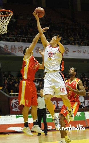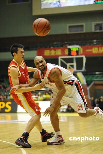 12月5日,2008—2009賽季CBA聯(lián)賽第九輪在山東濟(jì)南的一場比賽中,主場作戰(zhàn)的山東黃金隊以108比78戰(zhàn)勝青島雙星隊。中新社發(fā) 張侃 攝
