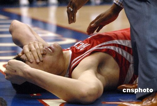 當?shù)貢r間十二月十三日晚,NBA休斯敦火箭隊在洛杉磯客場挑戰(zhàn)洛杉磯快船隊,結(jié)果以八十二比九十五失利。第三節(jié)開始不久,姚明左眼被擊中后痛苦倒地,被迫暫時離場醫(yī)治,幾分鐘后姚明重新上場。但此后,火箭隊被逆轉(zhuǎn),最終失利。中新社發(fā) 張煒 攝
