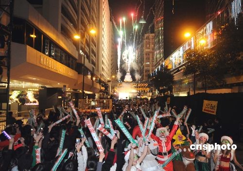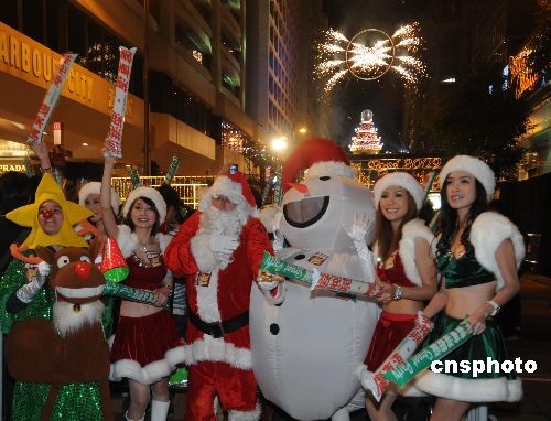 十二月二十四日晚(平安夜),逾十萬市民及游客齊聚香港尖沙咀鬧市,參加圣誕倒數(shù)街頭派對,圣誕老人、圣誕女郎及雪人在場助興,節(jié)日氣氛濃厚。中新社發(fā) 蔡蔓莉 攝