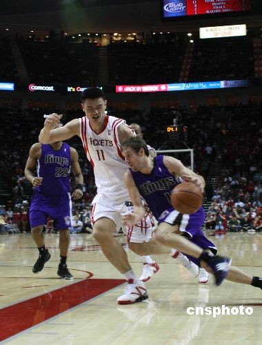 當(dāng)?shù)貢r間2月11日,火箭隊在休斯頓豐田中心以94-82擊敗阿帥舊部——聯(lián)盟倒數(shù)第一的國王,贏得了全明星賽前的最后一場比賽。姚明全場貢獻(xiàn)了24分18個籃板,均為全場最高。中新社發(fā) 歐文 攝