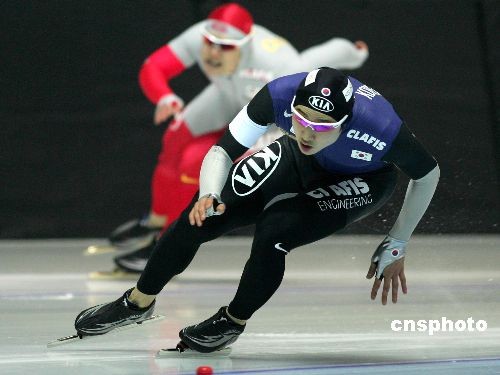 2月19日,世界大學生冬季運動會在結束女子首金爭奪后,男子500米速度滑冰的比賽也產生了金牌。韓國選手選手李康爽以兩輪69秒82的成績問鼎冠軍,為韓國隊再添一金。中國隊賽前對金牌志在必得的于鳳桐落后0.05秒,屈居亞軍,銅牌則最終歸屬于韓國選手毛太范,成績?yōu)?0秒53。中新社發(fā) 富田 攝
