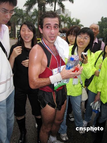 “九洲杯”珠海首屆半程馬拉松邀請(qǐng)賽于二十二日早上八點(diǎn)鳴槍起跑,該項(xiàng)賽事吸引了境內(nèi)外兩千名長(zhǎng)跑愛好者參加。經(jīng)過一番角逐,本次半程馬拉松賽的男子總冠軍由亞洲半程馬拉松紀(jì)錄保持者、香港選手史提芬奴贏得,女子總冠軍則由十六歲的中國(guó)籍女孩楊麗文奪得。圖為史提芬奴在結(jié)束比賽后接受記者的訪問。中新社發(fā) 鄧媛雯 攝