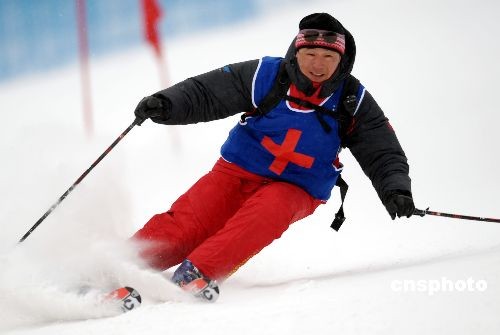 2月24日,在大冬會亞布力滑雪場高山滑雪大回轉(zhuǎn)比賽中,大冬會醫(yī)療救護(hù)隊隨時出擊。圖為醫(yī)療救護(hù)隊馳騁在雪道上。中新社發(fā) 姚庭山 攝