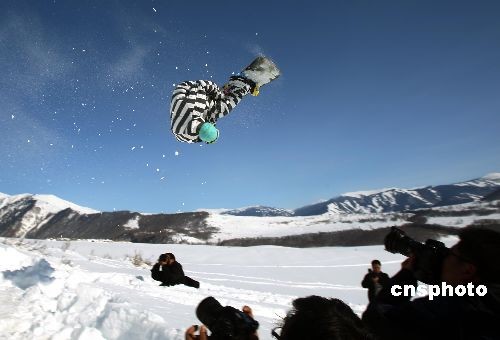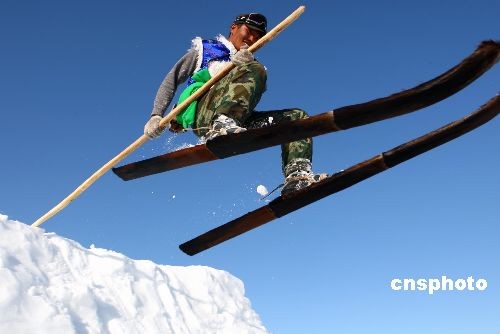 3月6日,首屆新疆喀納斯“雪上飛”杯單板野雪超級大回轉(zhuǎn)邀請賽,在新疆著名的旅游景點——喀納斯禾木村舉行,來自新疆各地7家滑雪場和單板俱樂部的37名選手參加比賽,演繹高山野雪的驚險與刺激。比賽間隙,專業(yè)運動員進行的單板跳臺特技表演與當(dāng)?shù)啬撩襁M行的阿勒泰古老毛滑雪板表演令參賽選手大飽眼福。中新社發(fā) 劉新 攝